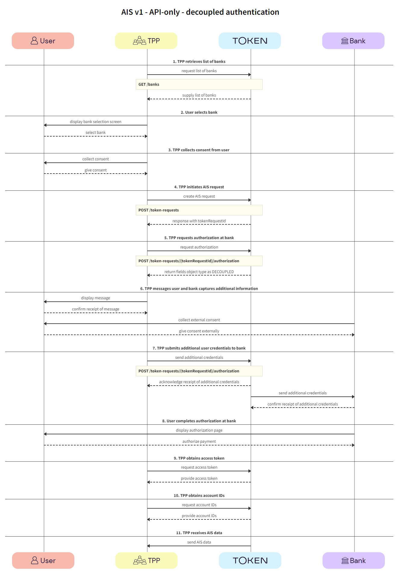 With decoupled authentication, the bank carries out an additional form of authentication external to the API AIS integration. This model allows for a number of solutions, for example using a mobile phone to authenticate, or using biometrics for authentication through a separate terminal, such as a point of sale (POS) device.