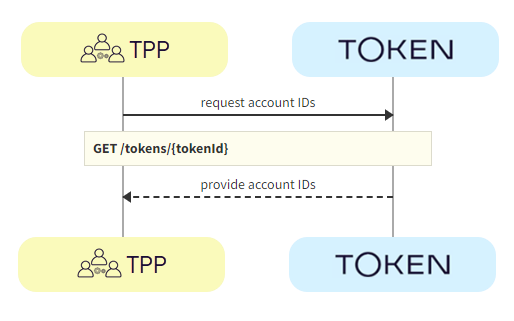 The TPP calls GET /tokens/{tokenId} using the access token ID obtained in the previous step. The response contains the account IDs used for calls to the endpoints in the next step.
