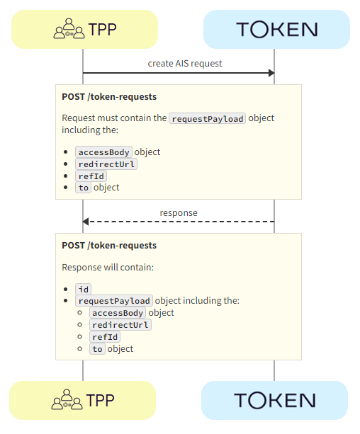The TPP initiates the token request with Token.io using the POST /token-requests call. Token.io responds by acknowledging the details of the request.