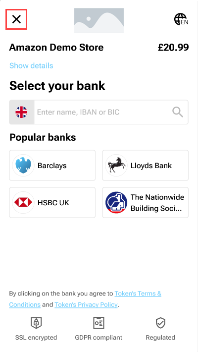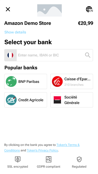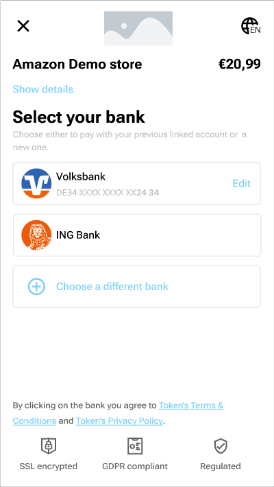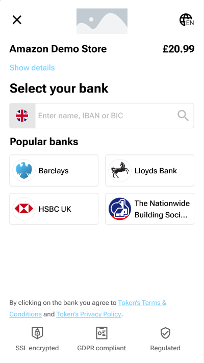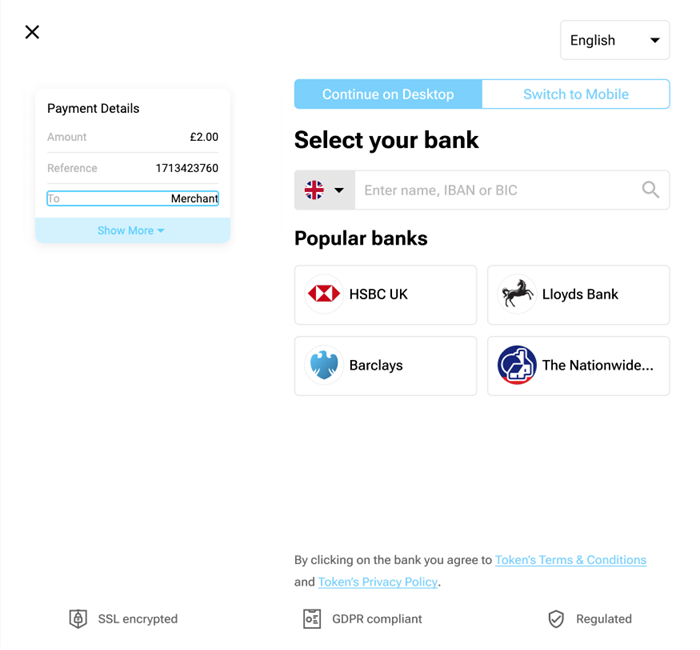 Token.io's HP guide the user through request initiation to consent and authentication with the bank. Here are example of user journeys using UK and EU banks, on both mobile and desktop.