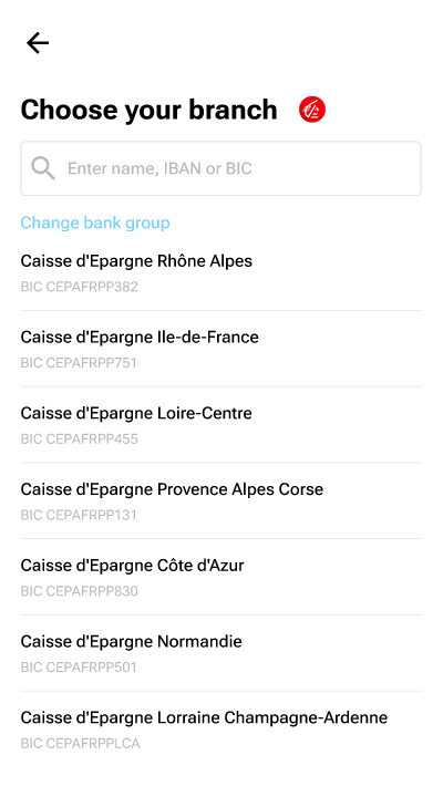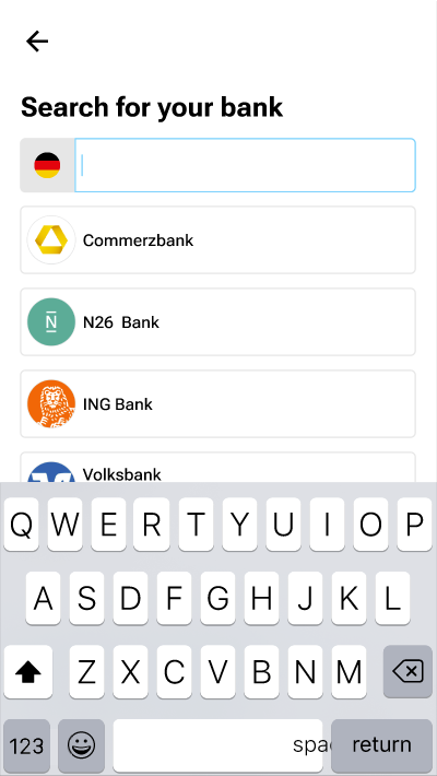 Users can search the list of banks by entering a full or partial bank name, BIC, IBAN or bank code (e.g., BLZ). If a full bank name, BIC, IBAN or bank code is provided and a match is found, a single result is displayed.