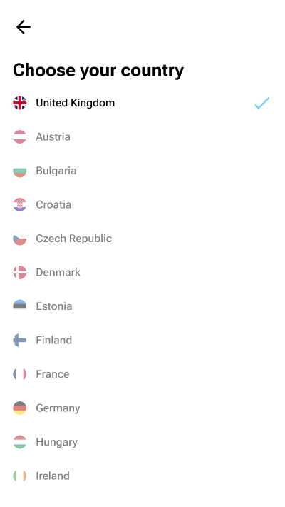 The user can change the country in the HP by clicking the Country button on the Select your bank dropdown and then selecting the required country from the list.