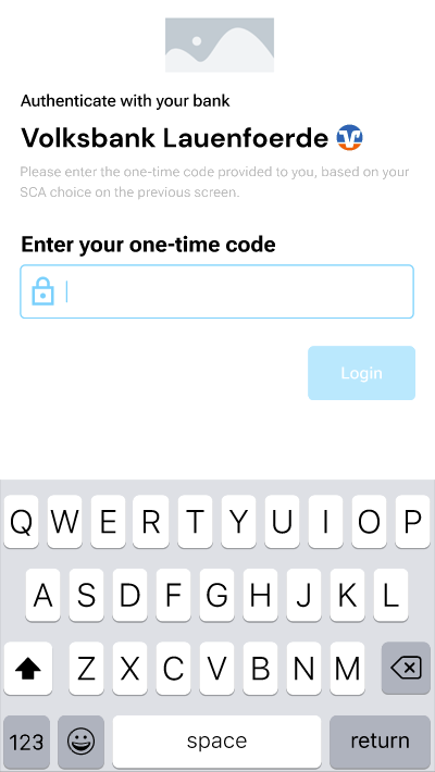 As this is a returning user, the onboarding screen is not displayed but the user is asked to authenticate using an SCA method. This example uses a PIN to access the user's account and then allows the user to select the SCA method.