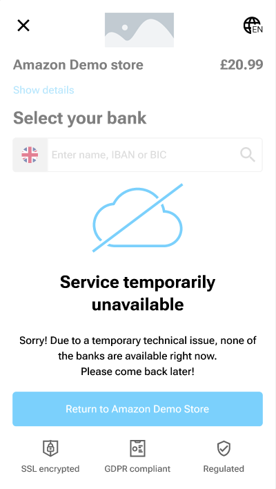 This screen is displayed when the service (Token.io's A2A payments infrastructure) is unavailable.