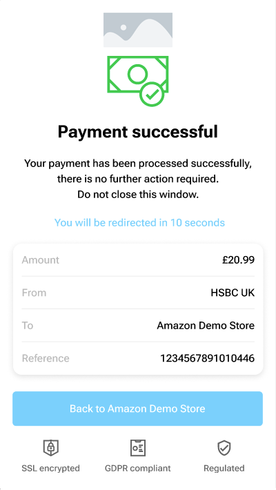 This screen gives you the options to return to the merchant or a redirect option. The redirect button's behavior will depend on the type of bank integration: