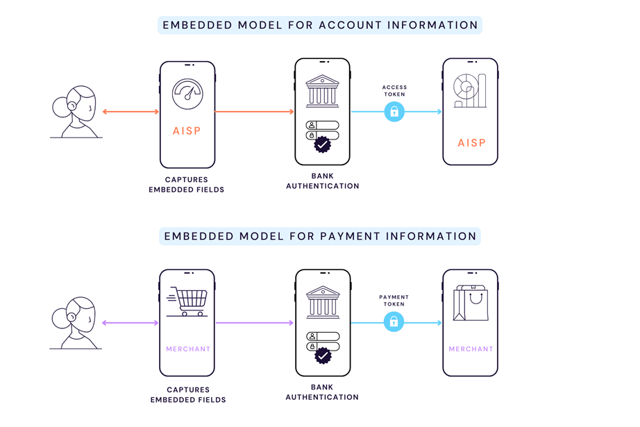The embedded model is executed entirely through the UI presented by the TPP. User verification is managed locally using a trusted identity provider (IDP) like the device manufacturer (OEM) — wherein user authentication is performed by embedded apps like Apple Pay, Samsung Pay, and Android Pay, among others; typically using biometric verification; i.e., fingerprint scan, iris scan, or FaceID — or through an IDP service like OKTA, which evaluates user authenticity based on the correct entry of a OTP.