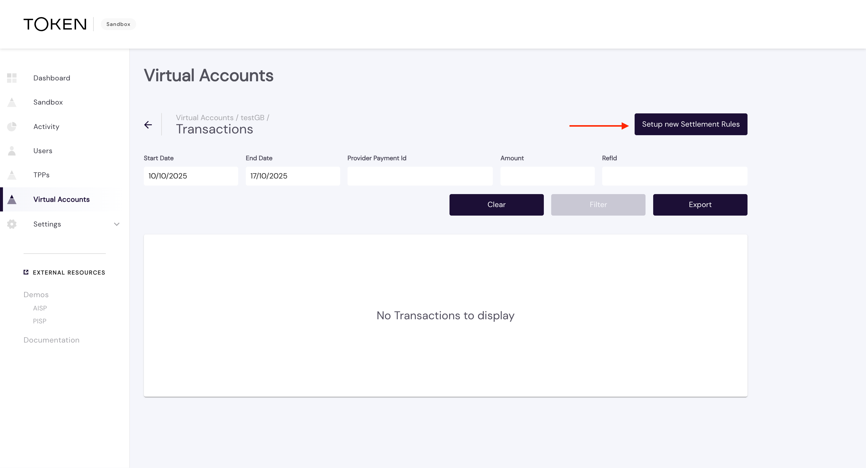 - View the Transaction list for the Virtual Account. Select "Set up new Settlement Rules" in the top right. You will be presented with fields as follows: