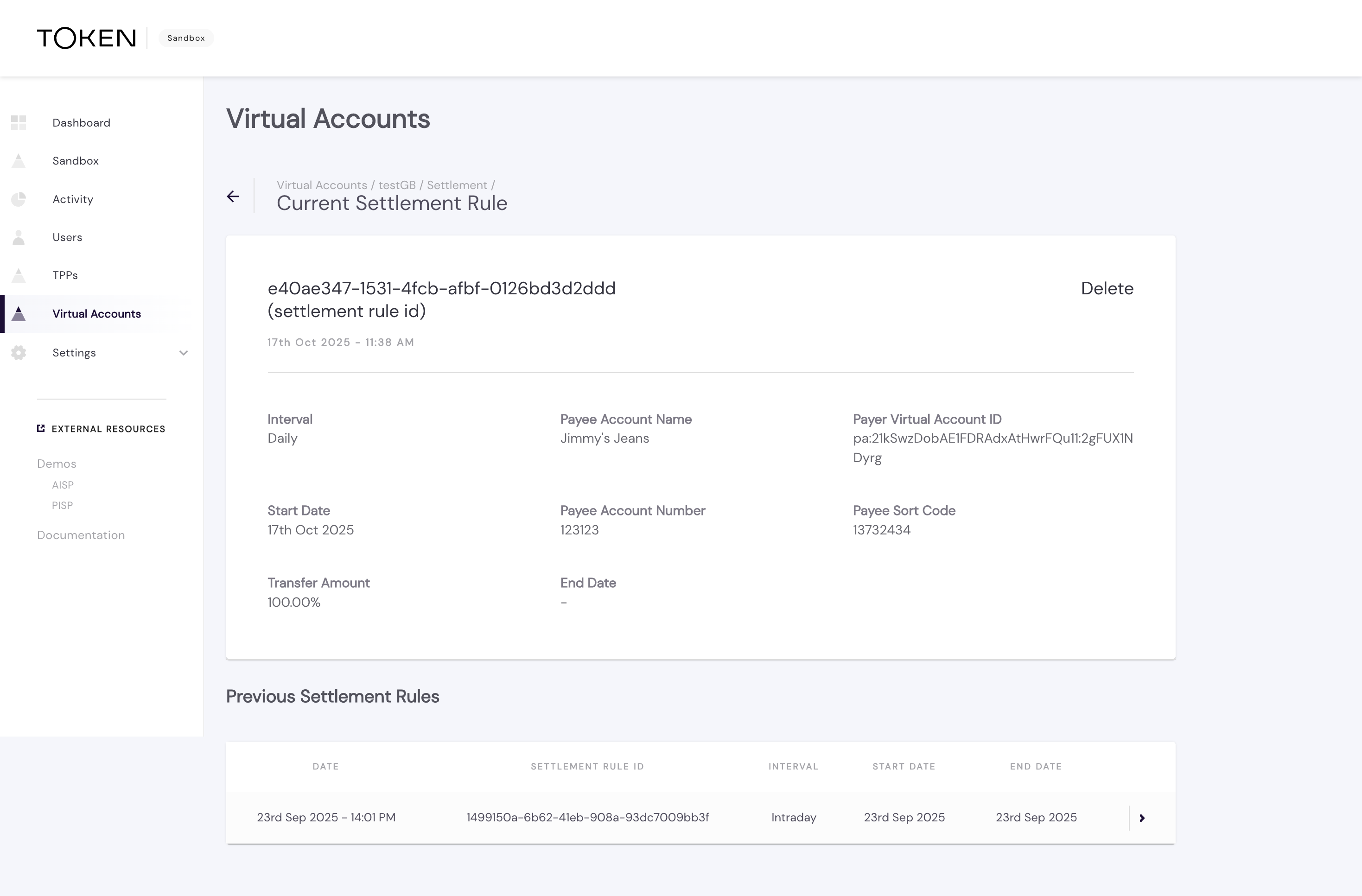 Rule Deletion: Settlement rules can be deleted at any time. Payments already initiated will continue processing and are not cancelled.