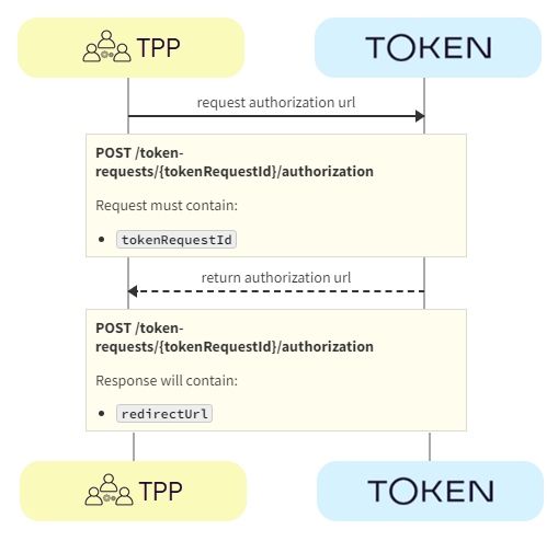 a. TPP -> Token.io - The TPP requests the bank authorization URL using the POST /token-requests/{tokenRequestId}/authorization call.