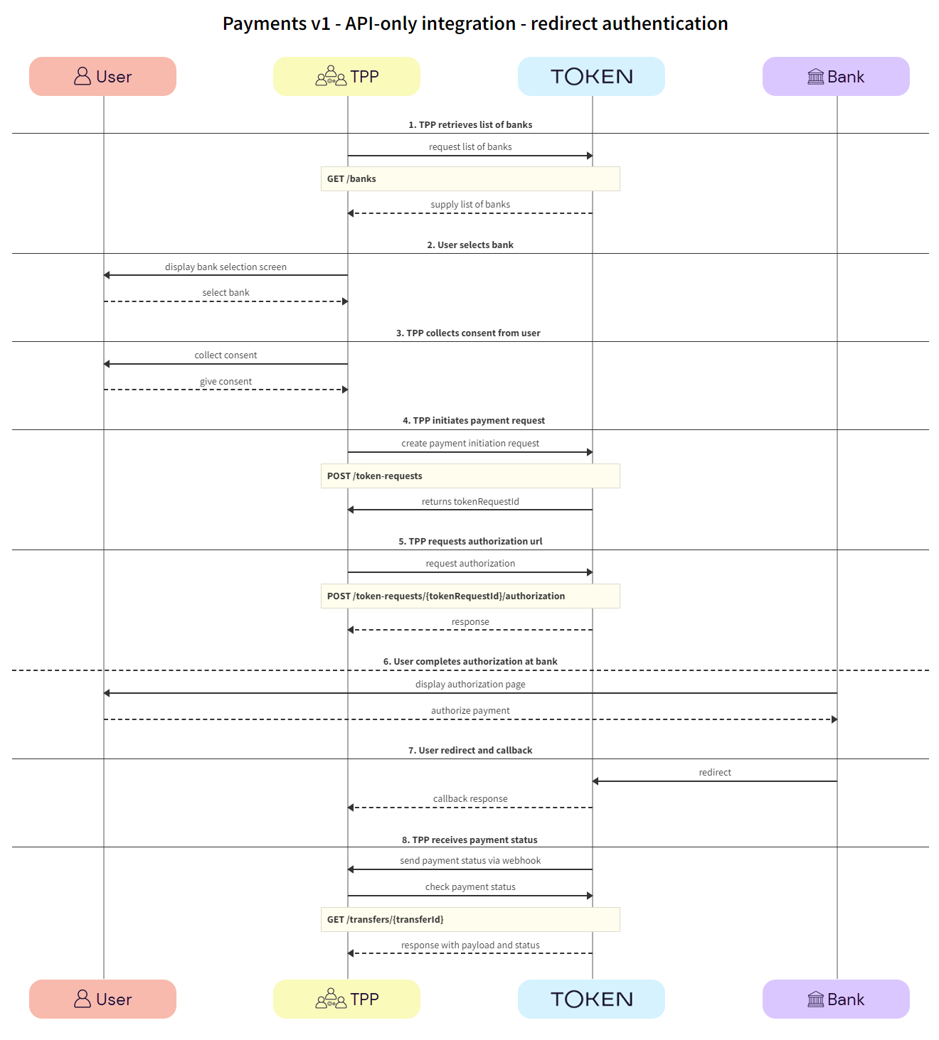 This section describes the API integration where the TPP owns the full user experience. We recommend that TPPs use webhooks to receive notification of the payment status.
