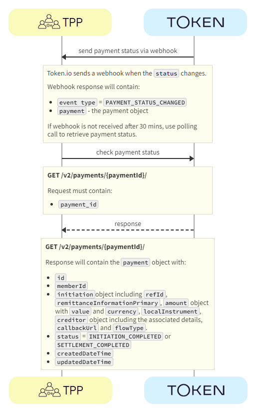 b. TPP -> Token.io - The TPP checks the status with Token.io with the GET /v2/payments/{paymentId} request.