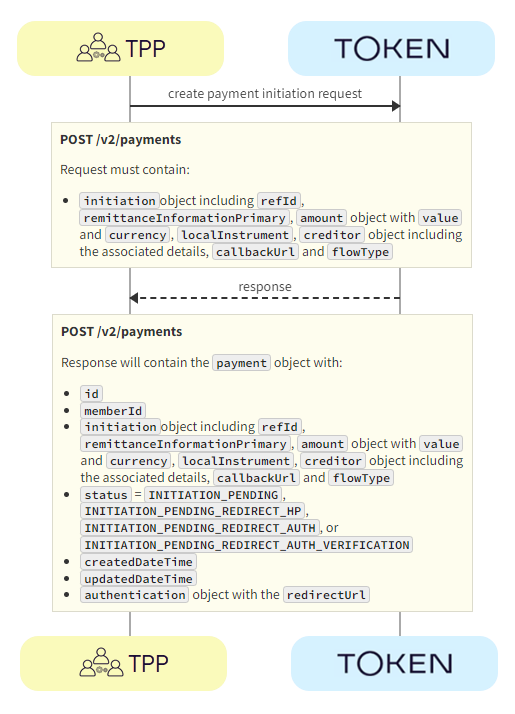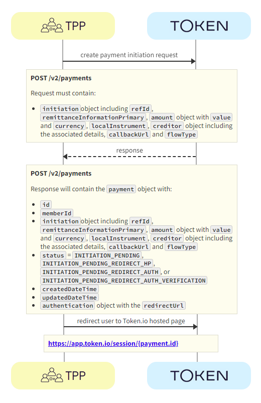 a. TPP -> Token.io - The TPP creates the payment initiation request using the POST /v2/payments call.