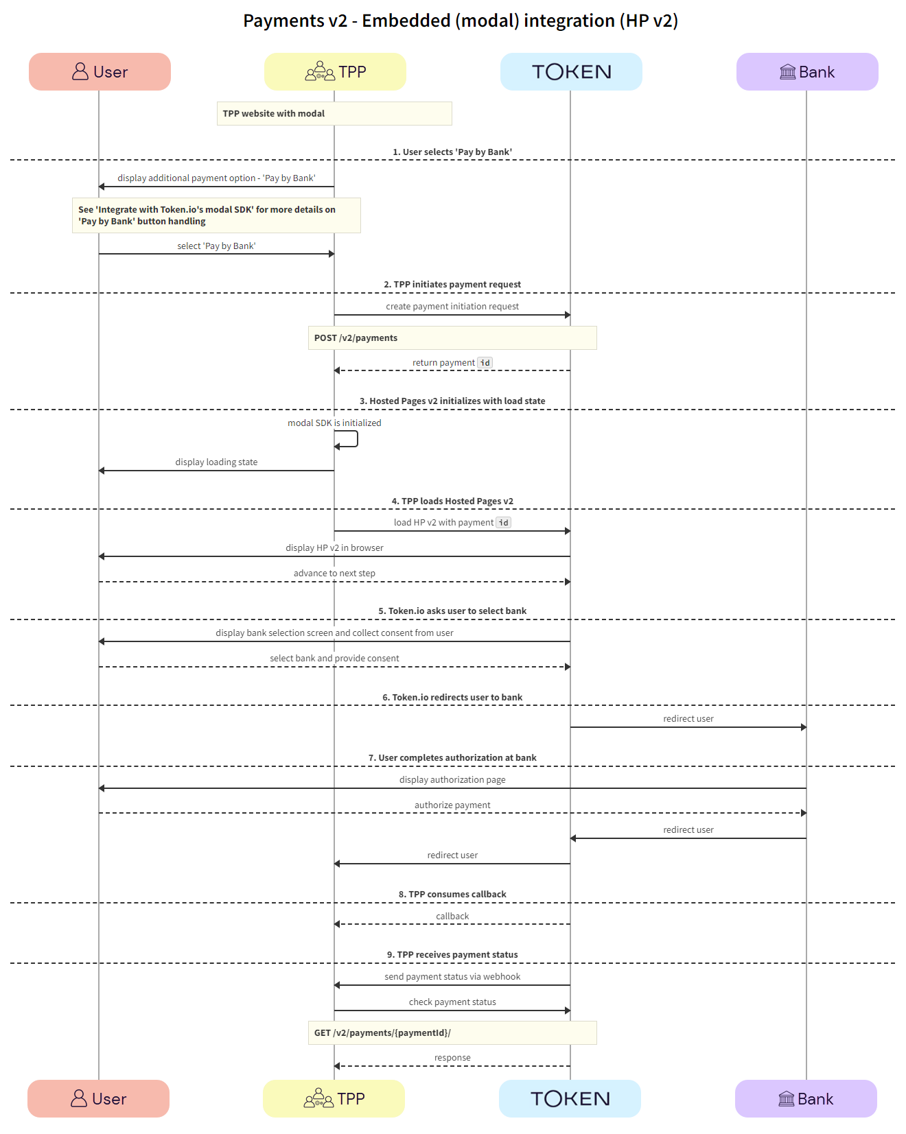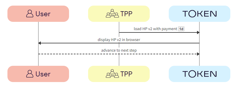 a. TPP -> Token.io - The TPP loads the Hosted Pages in modal SDK using the redirect URL containing the payment id.