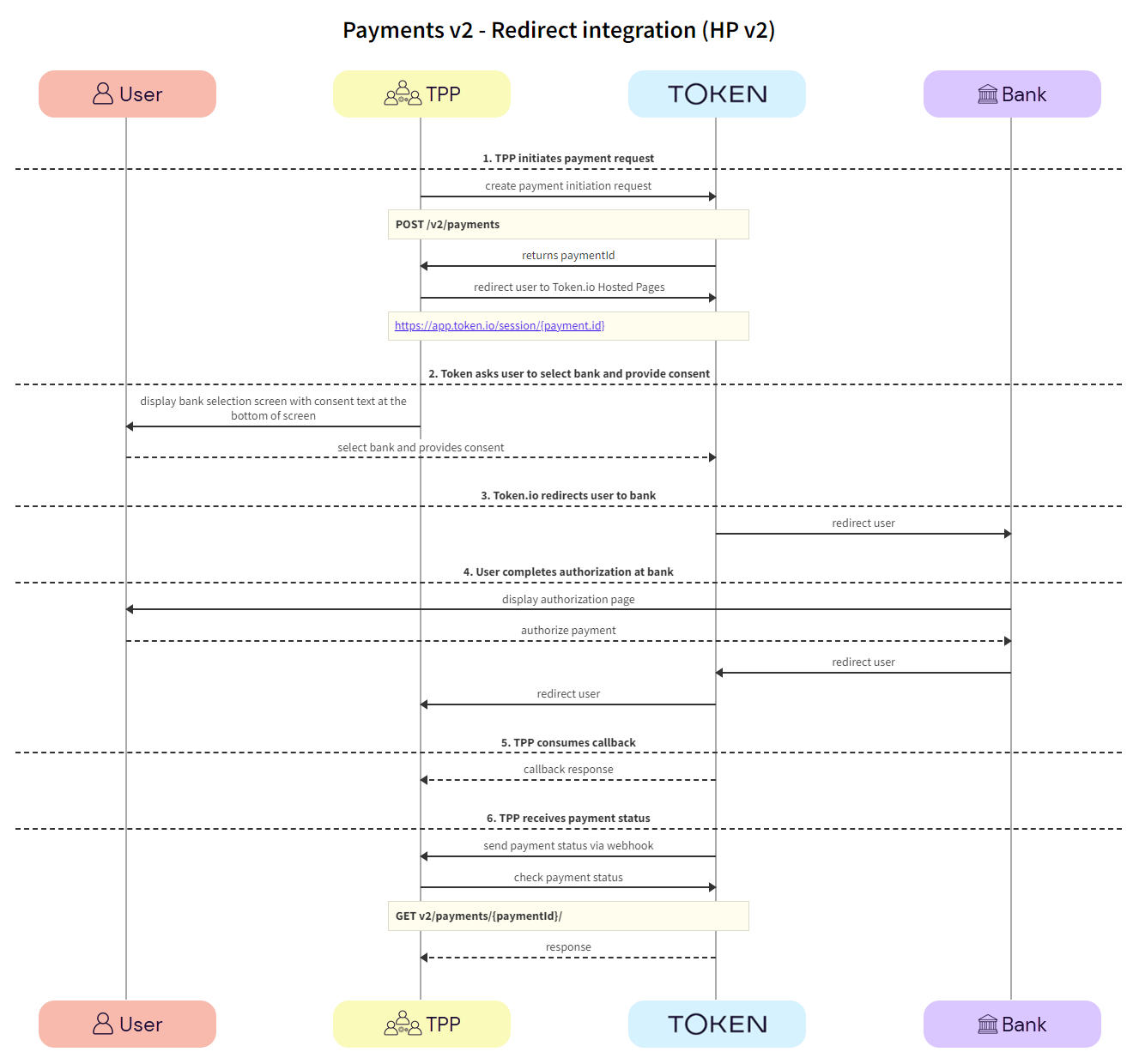 Token.io's Hosted Pages (HP) guide the user through payment request initiation, consent, and authentication with the bank.