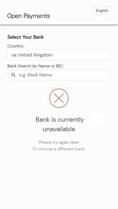 If you're using the hosted payments page (Token.io Hosted Pages) for bank selection, where the TPP owns the full user experience, you will see the new Bank is currently unavailable page when the bank is down.