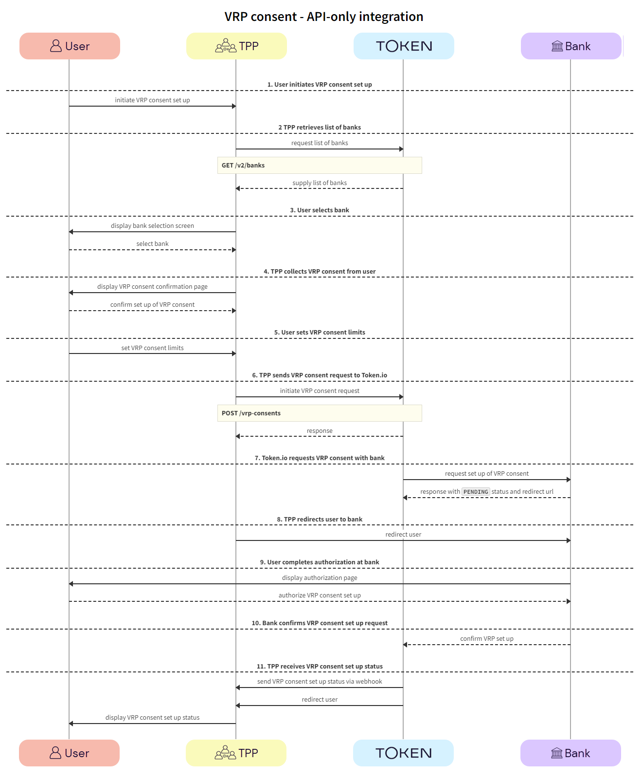 The TPP initiates the consent request with Token.io using the POST /vrp-consents call.